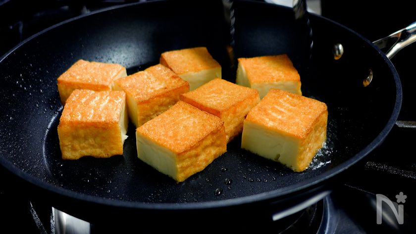 (4) フライパンにサラダ油をひき中火にかける。温まったら厚揚げを入れ、あまり動かさず両面に焼き目をつける。