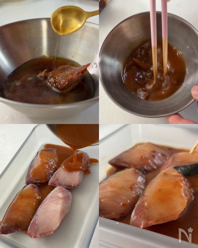 (1) バットにぶりを並べ、混ぜ合わせた【A】を絡めて10分ほどおく。