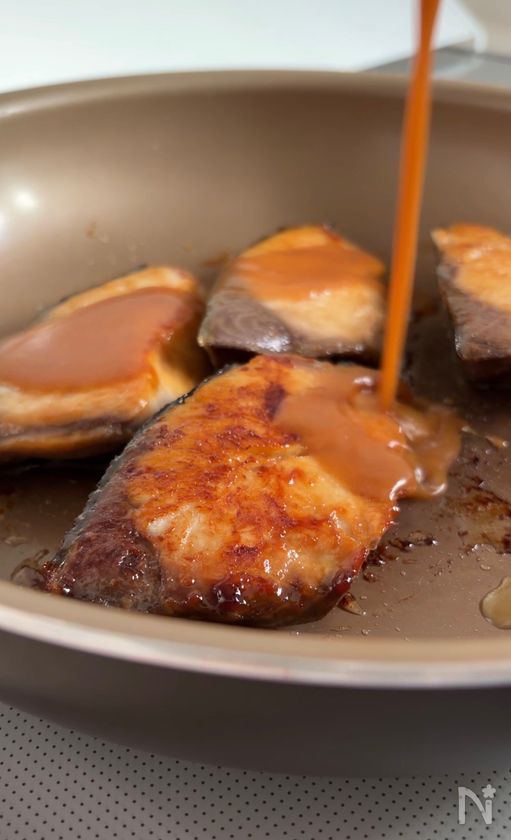 (2) フライパンに油大さじ1/2ひき、弱めの中火でぶりを焼く。焼き色がついたら裏返し、残った【A】のたれを加えて絡め、火止め直前に追いレモン汁を回しかけてさっと加熱する。