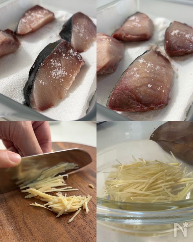 (下準備) ・ぶり(切り身)の両面に少量の塩(下処理用)をふって10分おく。出た水分をキッチンペーパーでしっかり拭き取る。