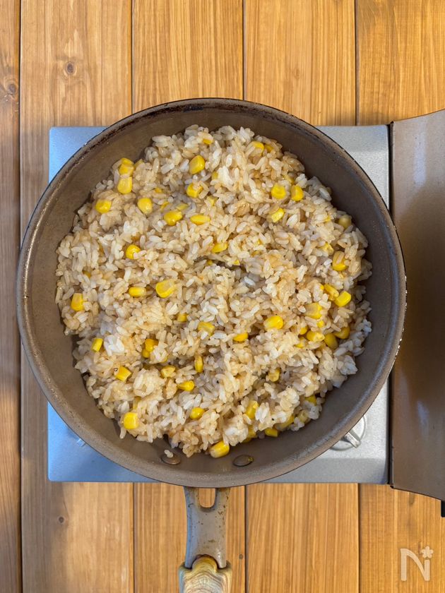 (3) フライパンに、水けを切ったコーン、ご飯、【B】を加えて中火で炒め合わせる。