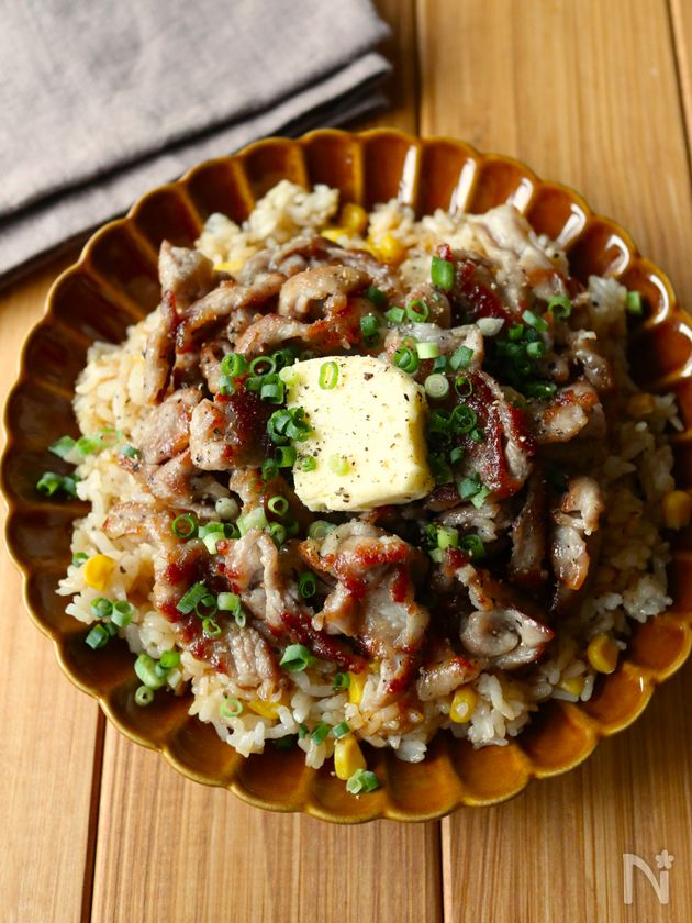 (4) 皿に3を盛り付け、その上に豚こま肉、有塩バターを乗せ、お好みで小ねぎ、黒こしょうをかける。