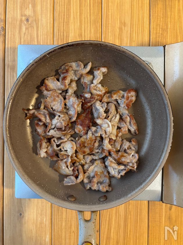 中火で熱したフライパンにサラダ油を引き、豚こま肉を加えて炒め、焼き色がついたら一度取り出す。