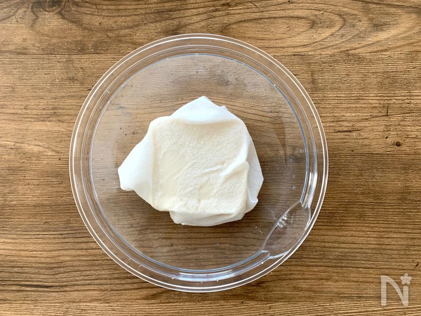 (1) 絹ごし豆腐をペーパータオルで包み、耐熱皿において600Wの電子レンジで2分30秒加熱し、ざるに上げておく。