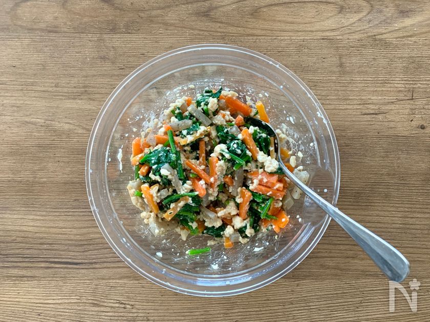 (5) 【A】を加えて混ぜ合わせ、ほうれん草、にんじん、こんにゃくを加えて和える。