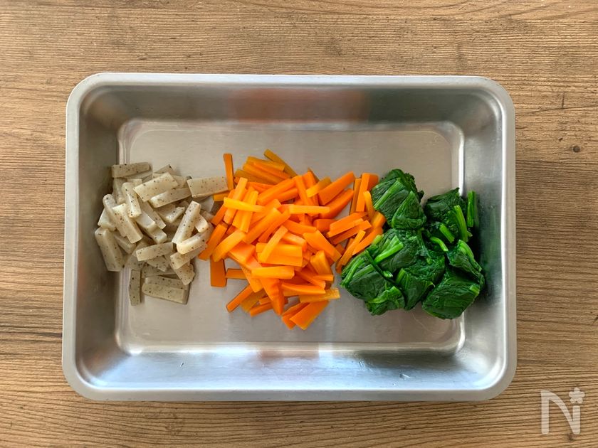 (3) 鍋に湯を沸かして塩少々(分量外)を入れ、にんじん、ほうれん草、こんにゃくの順に茹でる。