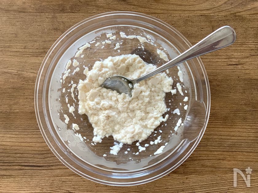 (4) ボウルに絹ごし豆腐を入れてスプーンなどでつぶす。この時水けがあれば新しいペーパータオルで拭き取る。