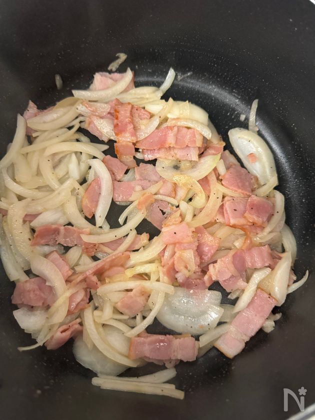 ベーコンから、油が出てきたら、にんにく(みじん切り)、玉ねぎを入れ、玉ねぎが透き通るまで炒める。