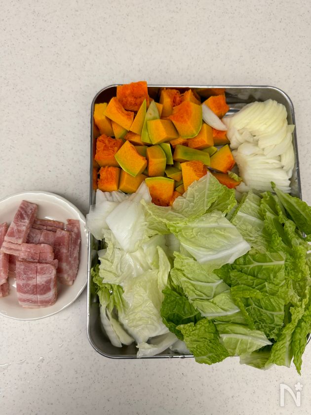 (3) 白菜の葉を入れ、しんなりしたら、【A】を入れ、かぼちゃが柔らかくなるまで煮る。
