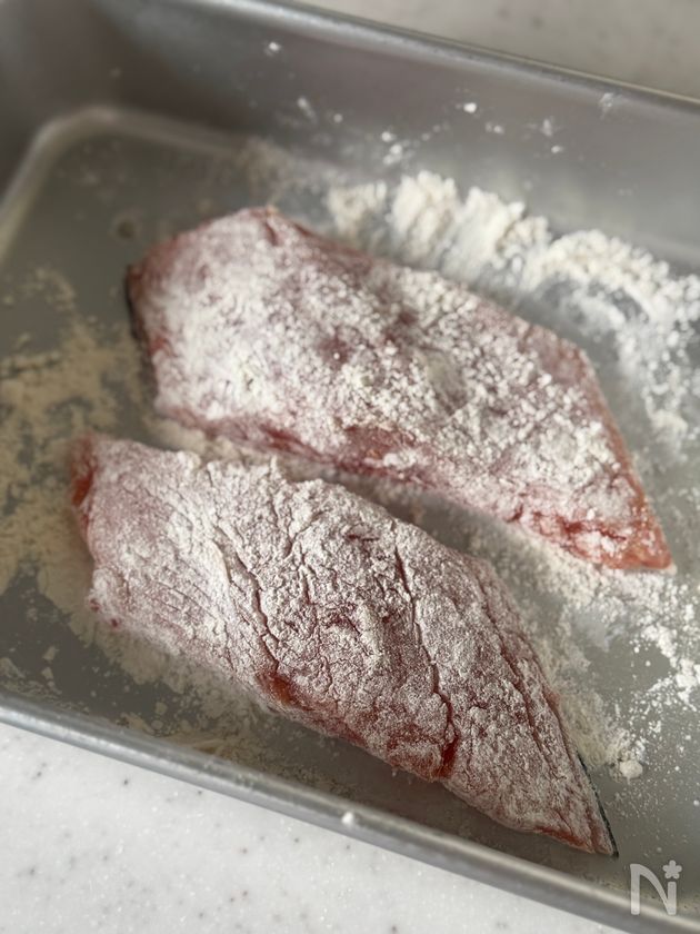 (2) 小麦粉をまぶす。
