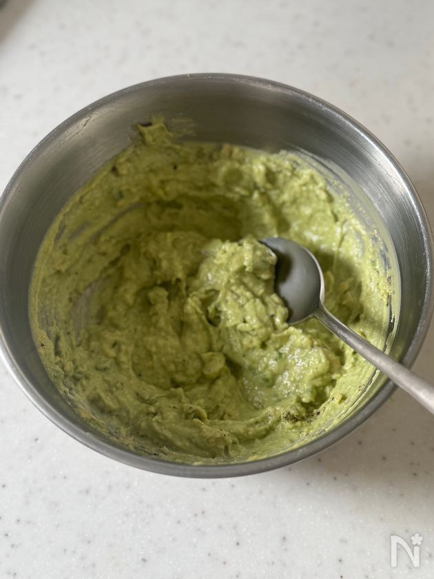 アボカドは縦半分に切って種と皮をとり、ボウルに入れてレモン汁をかけ、フォークでつぶす。【A】を加えてなめらかになるまで混ぜる。