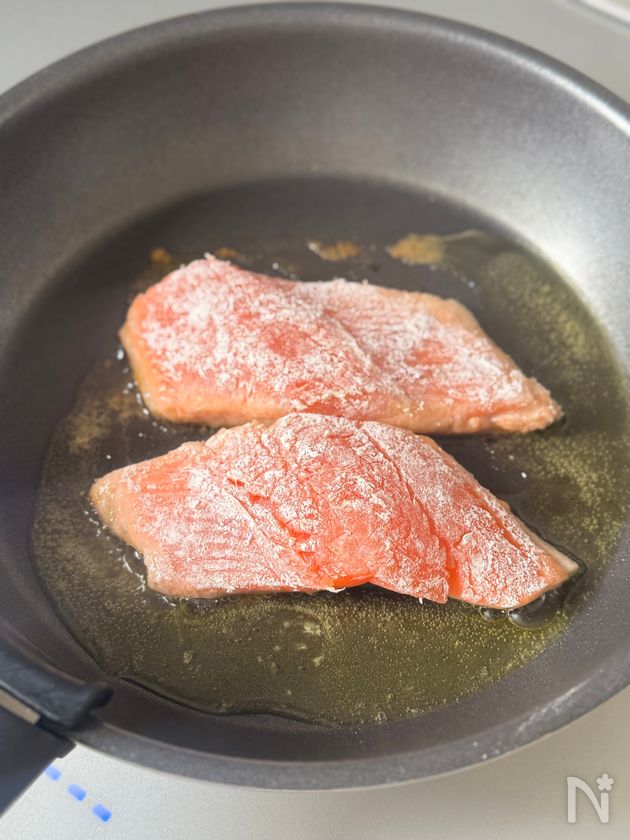 (1) サクラマス切り身は流水で洗って水気をふき、塩コショウをしっかりめにふる。少しおいて水分をペーパーでおさえる。
