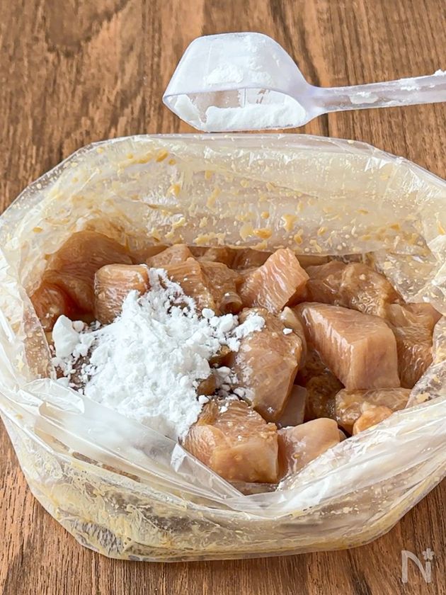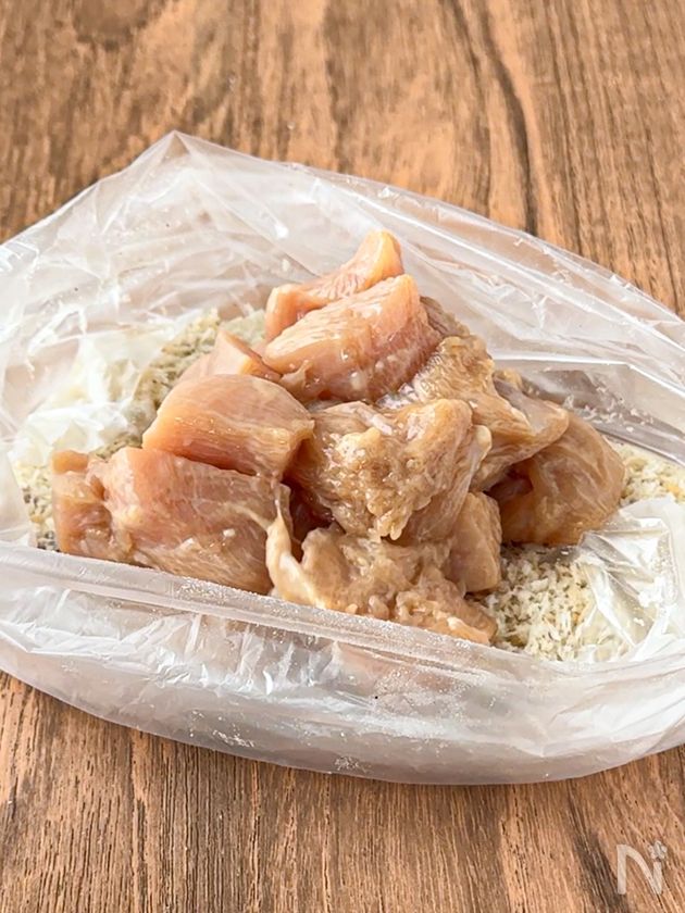 ポリ袋に【A】と一緒に入れてもみ込み5〜10分おく。