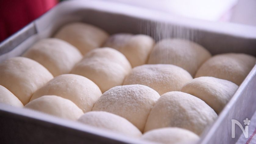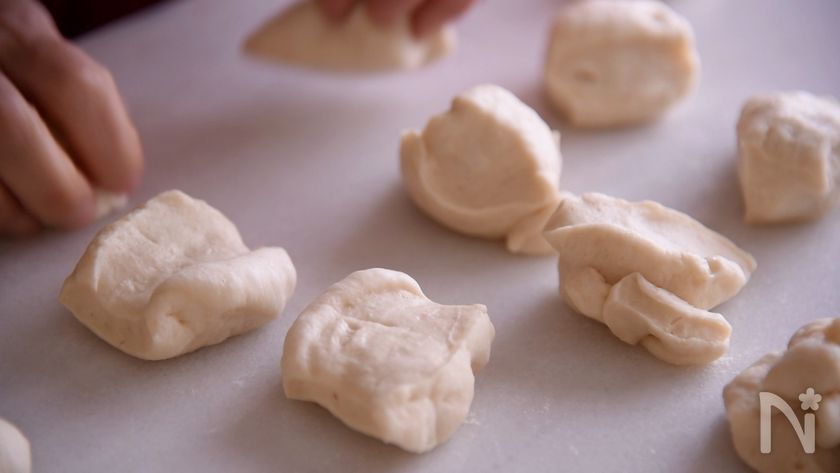 (2) 包丁やスケッパーで16等分にカットします。丸めてふんわりラップして、ベンチタイム。20分待ちます。