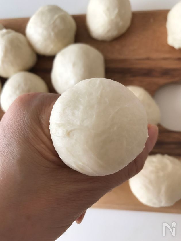 (3) 手でぎゅっと押しつぶしガス抜きしながら丸めて2次発酵します。生地の下はきゅっとつまんで丸めます。
