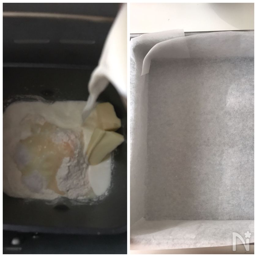 (下準備) 材料【A】を計量しホームベーカリーにセットして生地作りスタート。ドライイースト別に入れる機種はそこに入れてね。約1時間待ちます。型にオーブンシートを敷いておきます。
