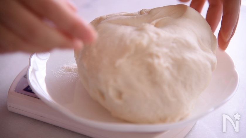 (1) 1次発酵が終わったら全体の重さを計ります。全体の量を16で割りその重さずつ16分割にします。