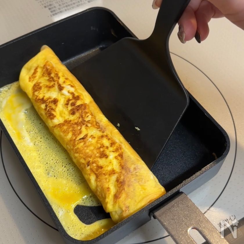 (3) 【C】を混ぜ合わせ、卵焼きを作る。卵焼き器の縦の長さに合わせ巻くと海苔巻きにピッタリの厚焼き卵ができます。