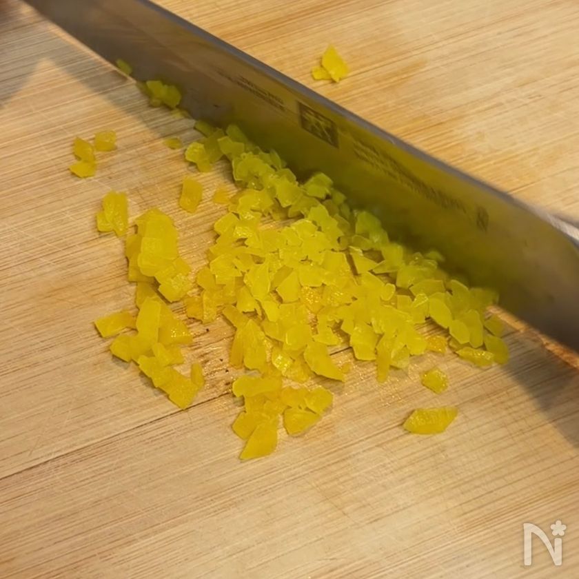 (下準備) たくあんをみじん切りし、冷凍エビフライを揚げておく。