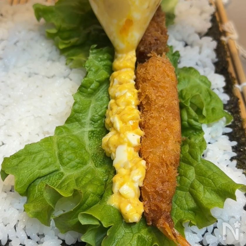 巻き簾に海苔を乗せ、奥2センチほど開け酢飯を200g塗り広げ、レタス、海老フライ、タルタルソースを並べ巻く。