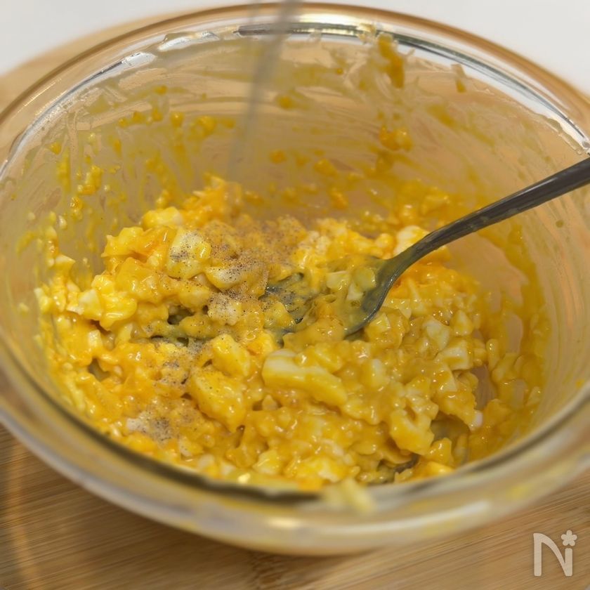 (2) 【B】をフォークで潰しながら混ぜ、タルタルソースを作る。