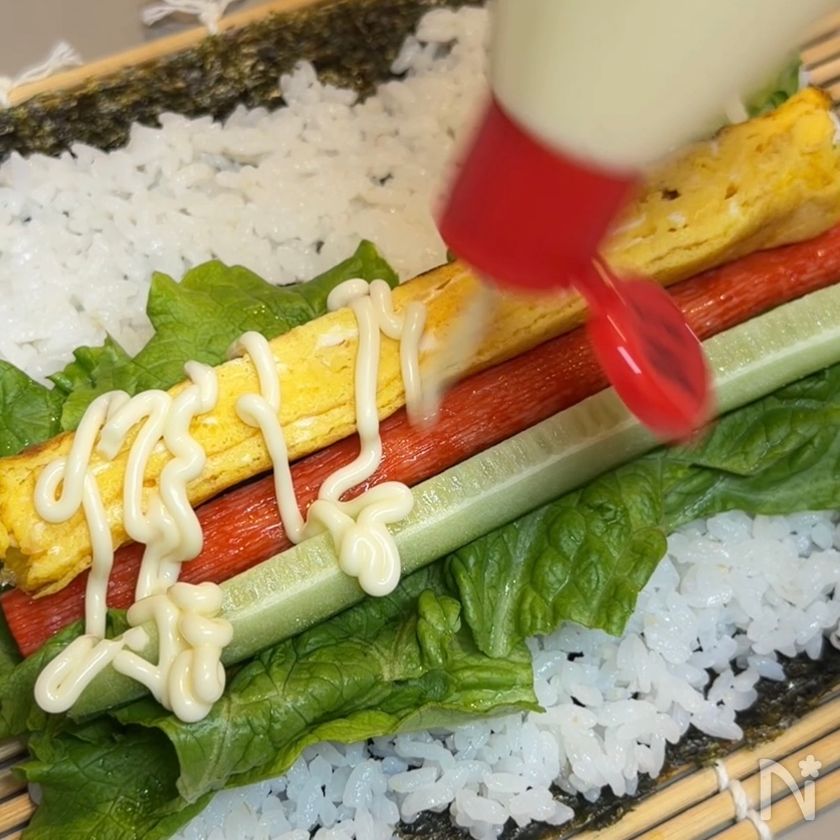 (4) 【サラダ巻き】巻き簾に焼き海苔を乗せ、奥2センチほど開け酢飯を200g塗り広げ、具材(レタス、カニカマ、きゅうり、厚焼き卵)を並べマヨネーズをかけ巻く。