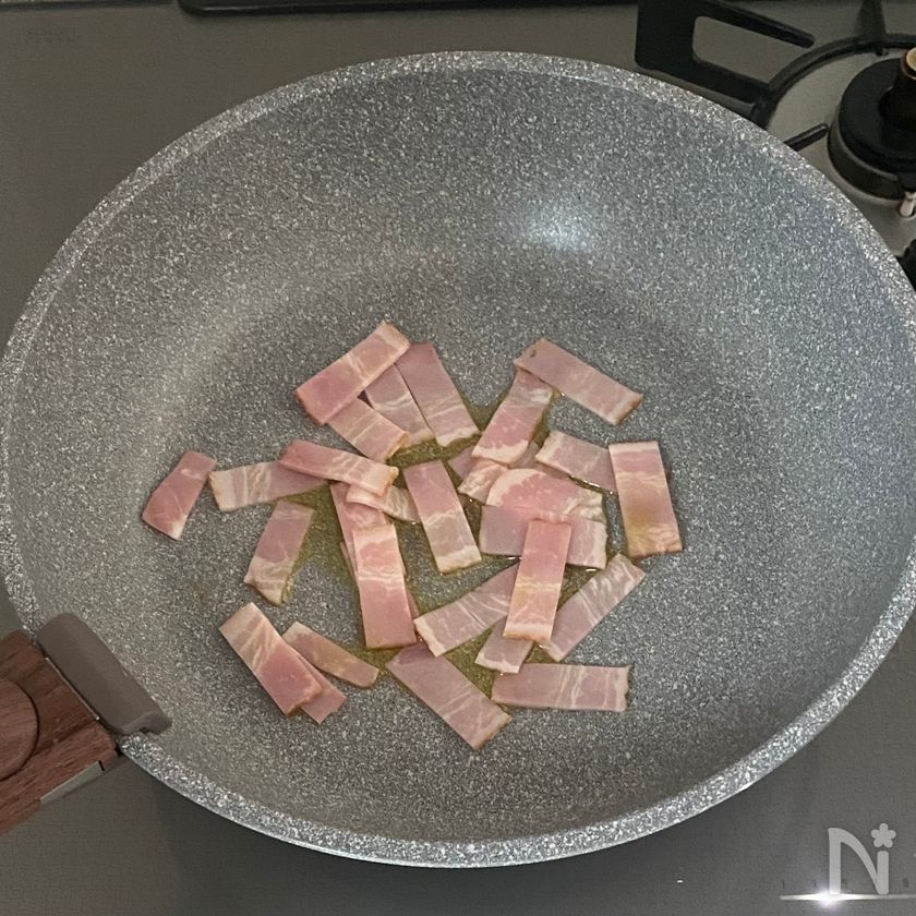 フライパンにオリーヴオイルとベーコンを入れて中火にかけ、カリッとなるまで炒める。