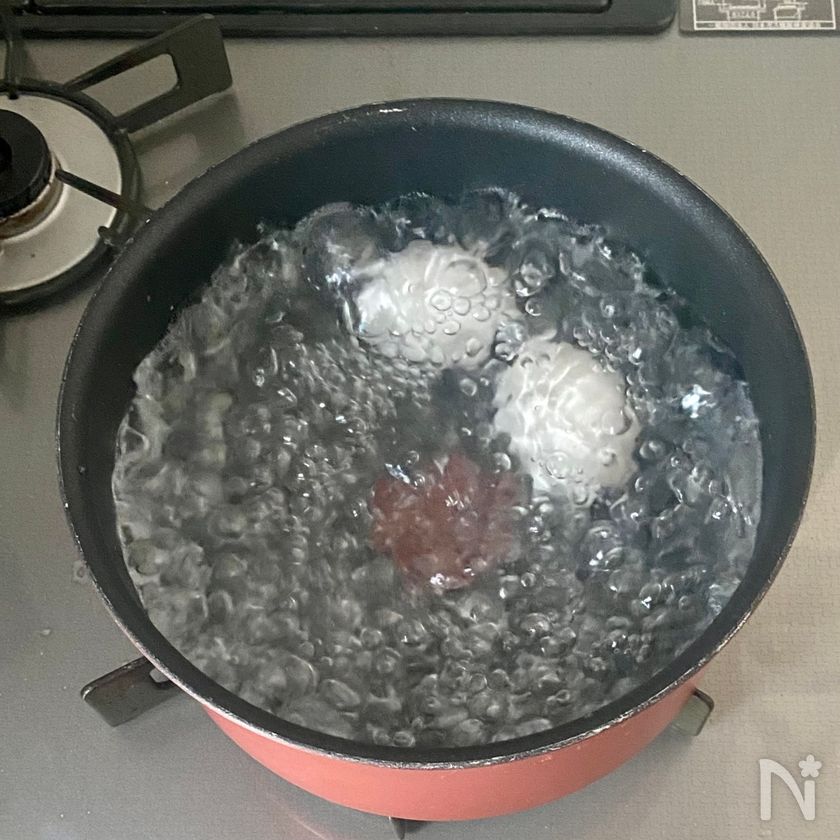 (2) 鍋のたっぷりのお湯を沸かし、卵を入れて再度沸騰してから6分30秒茹で、氷水につける。