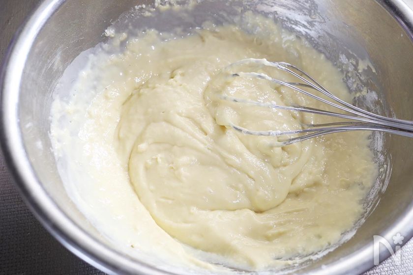 (2) ボウルに卵を割り入れてとき、牛乳、ホットケーキミックスを加えて粉っぽさがなくなるまでよく混ぜる。