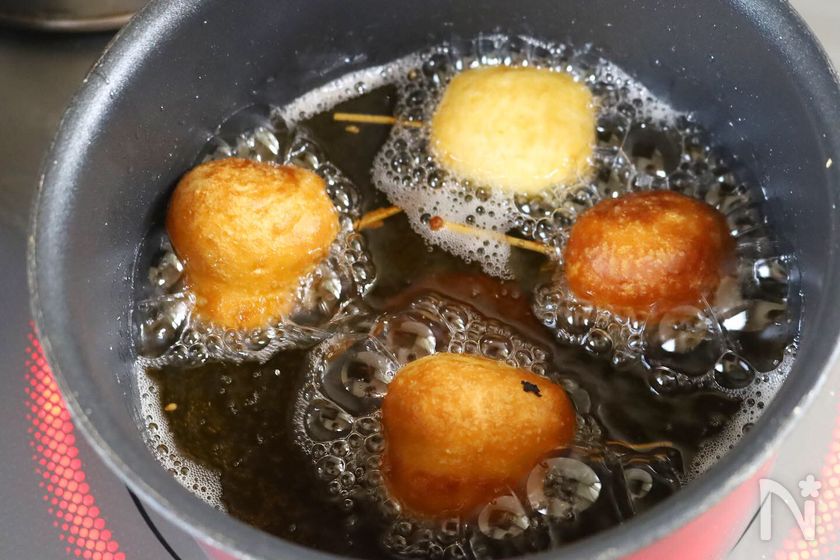 (4) 190度の油で全体がこんがりきつね色になるまで揚げる。