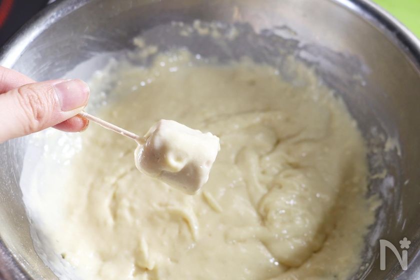 衣がサラサラして付きにくい場合は適宜ホットケーキミックスを足して調整してください。ホットケーキの生地よりもったりめにすると綺麗につきます。