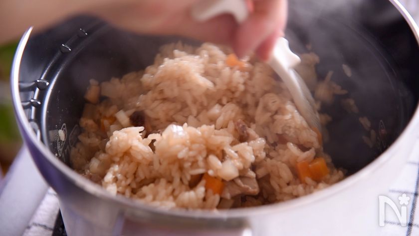 (9) 炊けたら軽く底から混ぜて蒸らせば出来上がり。