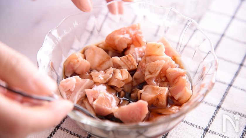 (4) 鶏もも肉は小さく切って、醤油(濃口)、酒、味醂、白だし、塩に浸けておきます。下味に浸けておくと味が染みるのと、臭みも取れます