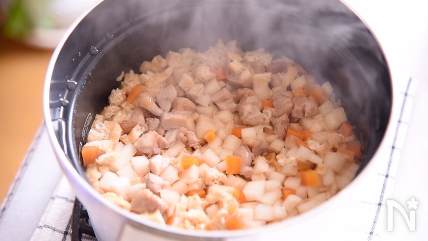 今回のレシピでは3合炊きの炊飯器を使用しています。お手持ちの炊飯器の大きさや取扱説明書をご確認のうえ、調理をお願いいたします。