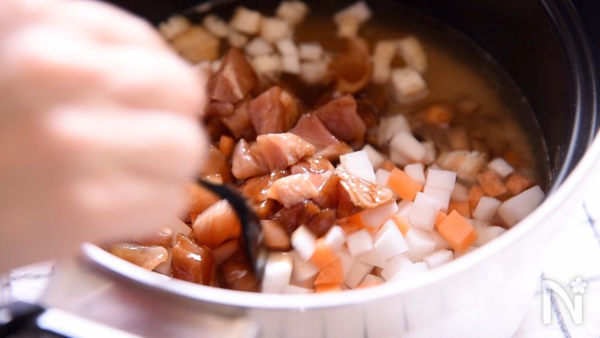 (7) 下味に浸けておいた鶏肉と他の具材を入れて軽く混ぜすぐに炊飯します。