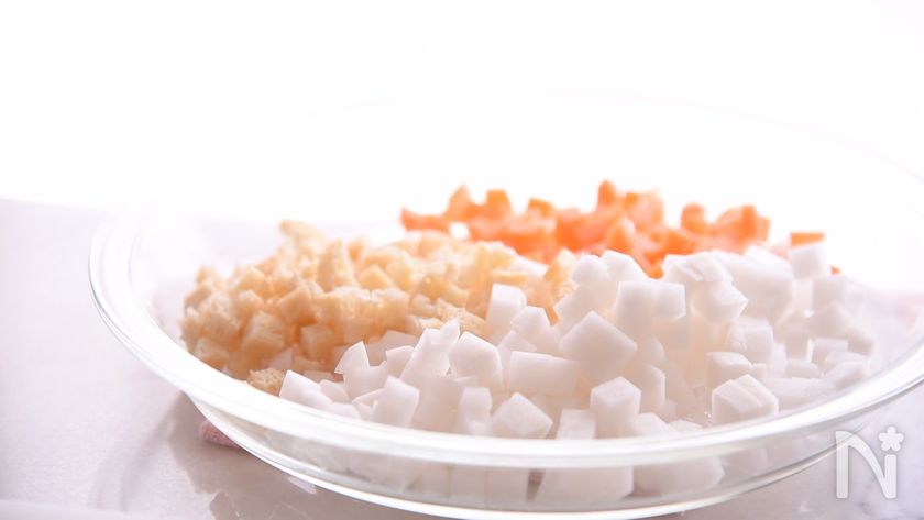 (3) 大根、人参、油揚げは小さく切っておきます。