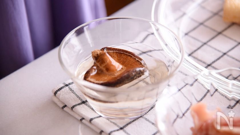 (2) 干し椎茸は分量外の水につけて戻しておきます。戻し汁は炊飯に使います。良い出し汁が取れるので美味しくなります。