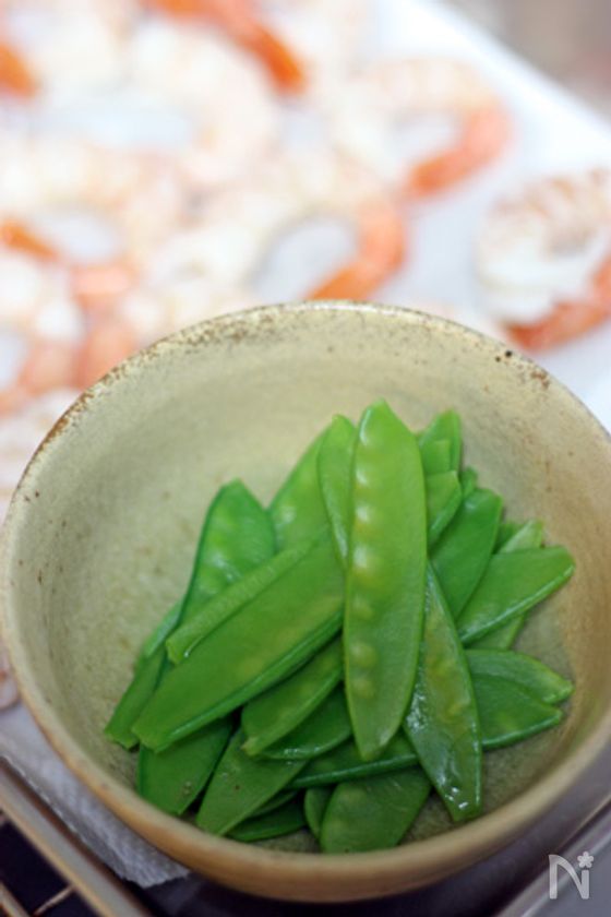 *絹さやは洗って筋をとり、塩水で軽くゆでる