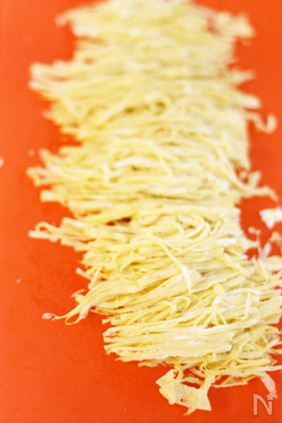 (2) *錦糸卵をつくる:卵3コをボールに割り入れて溶き、塩、三温糖を加えてよく混ぜる。油を薄くひいたフライパンで3回に分けて薄焼き卵を作り、細いせん切りにする