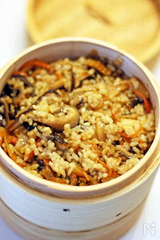 炊いた玄米に寿司酢を加えて混ぜ、3.の具と焼き穴子を加えて混ぜ合わせる。蒸篭に混ぜたごはんを入れ、錦糸卵、桜でんぶ、海老、絹さやを飾る。10分ほど蒸してできあがり。