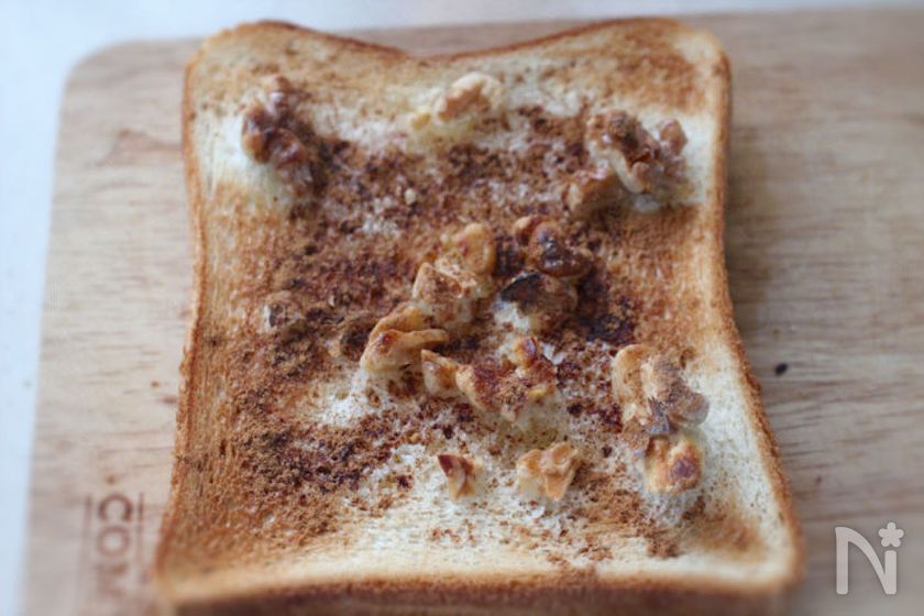 (3) こんがりトーストし、シナモンパウダー、1の粉糖をかけ、完成。