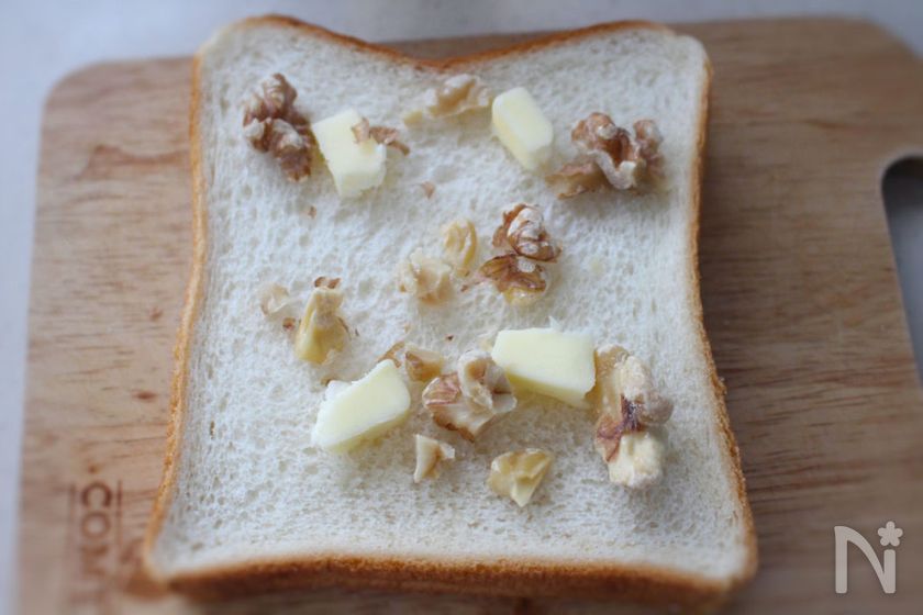 (2) 食パンに、割ったくるみとちぎったバターを散らしてトーストする。