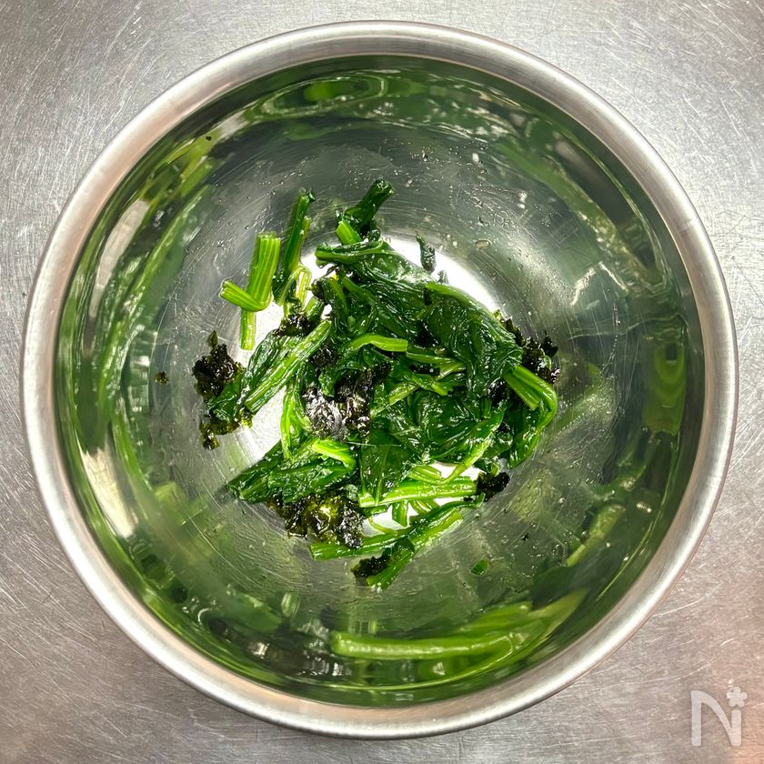 (3) ほうれんそうの水気を再び絞ってボウルに入れ、ごま油を加えてからめる。