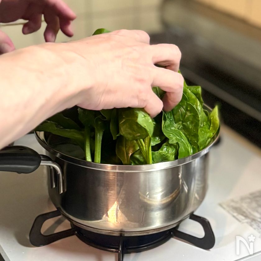 ほうれんそうを持って茎の部分を湯に入れて30秒ほどゆで、続いて全体を入れる。