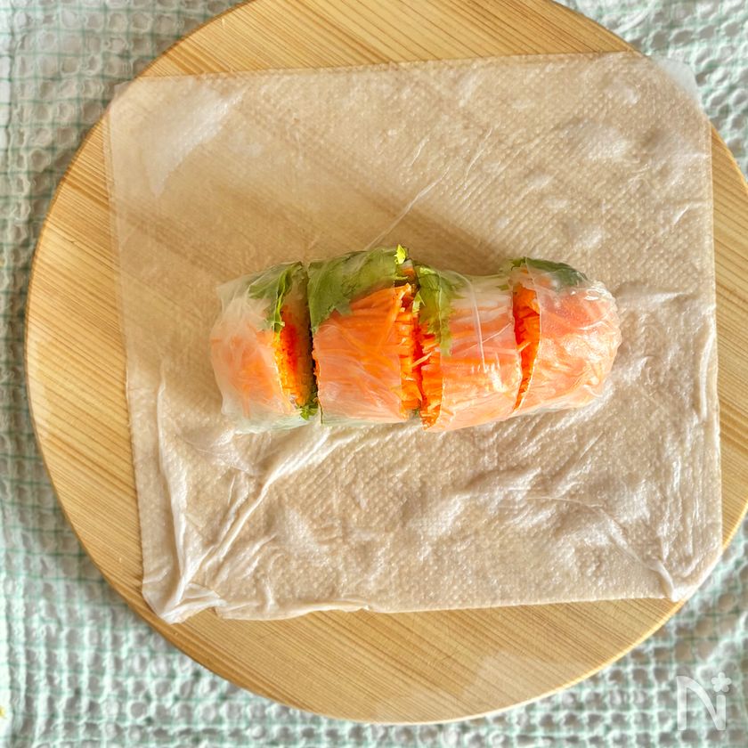 まな板の上に濡らしたキッチンペーパーを敷くことで生春巻きがくっついてしまうのを防ぎます。