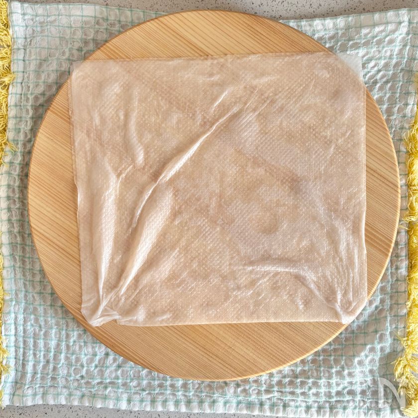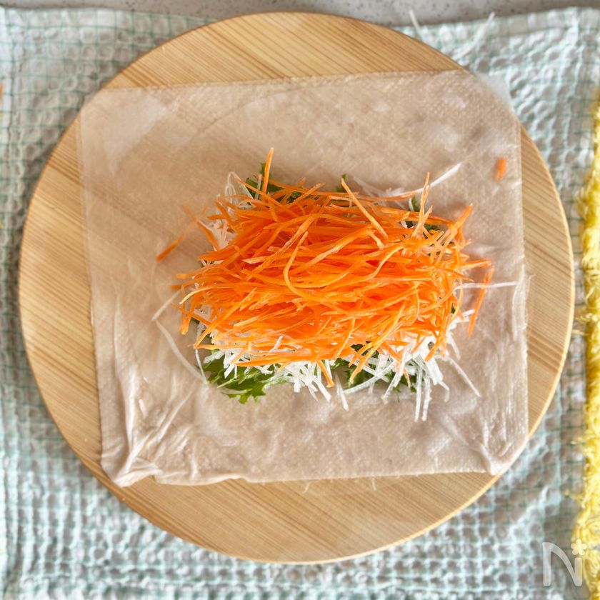 その上に水に潜らせた生春巻きの皮をのせる。