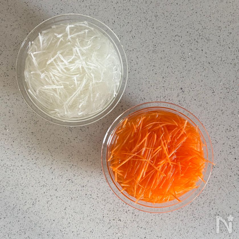 (下準備) 大根、人参は千切りにして水に5分程さらす。