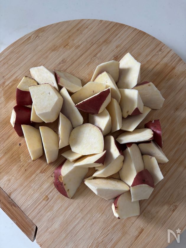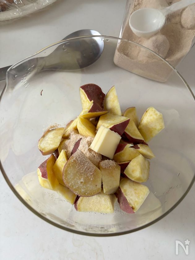 (1) さつまいもを小さめの乱切りにして耐熱ボウルに入れ、5分ほど水にさらす。