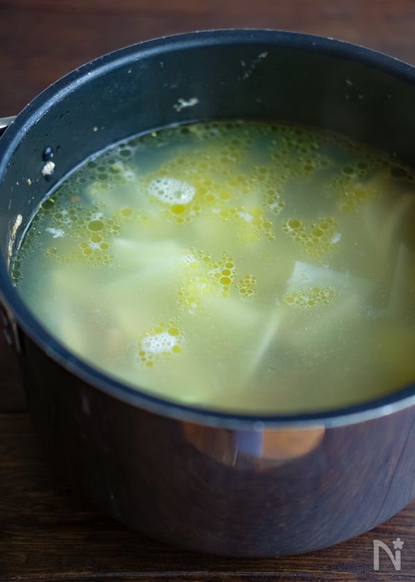 (2) 玉ねぎを取り出し、大根を加えて更に40分煮たら、味をみながら塩で味を調える。