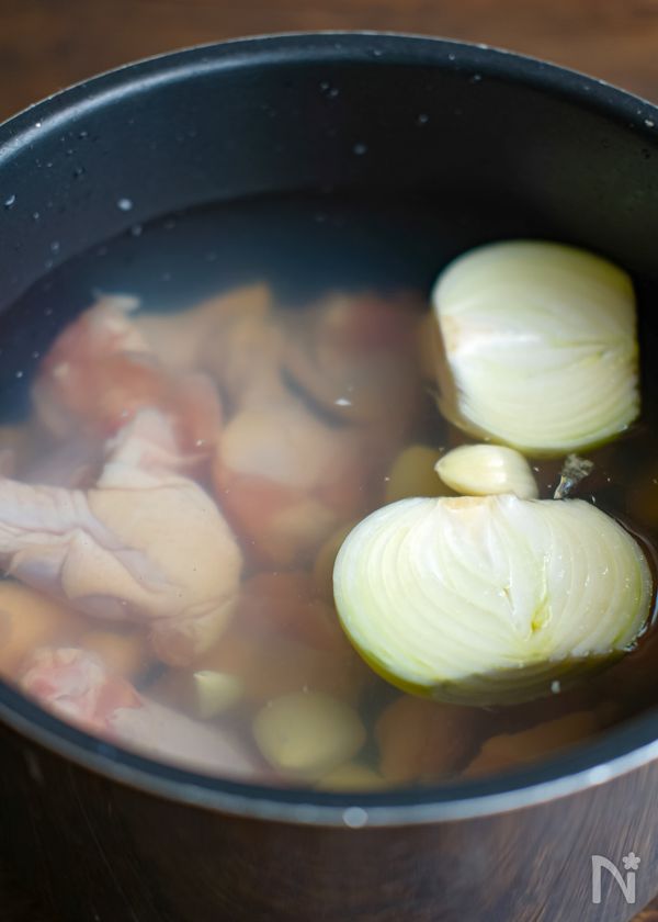 (1) 鍋に【A】と鶏手羽元、玉ねぎ、にんにくを入れて火にかけ、煮たったら灰汁をとり、蓋をして弱火で1時間煮る。
